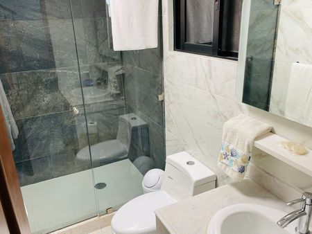 - **Tercer Piso:** Espaciosa recámara con cama king size y baño completo (regadera y tina), junto a una pantalla para tu entretenimiento.